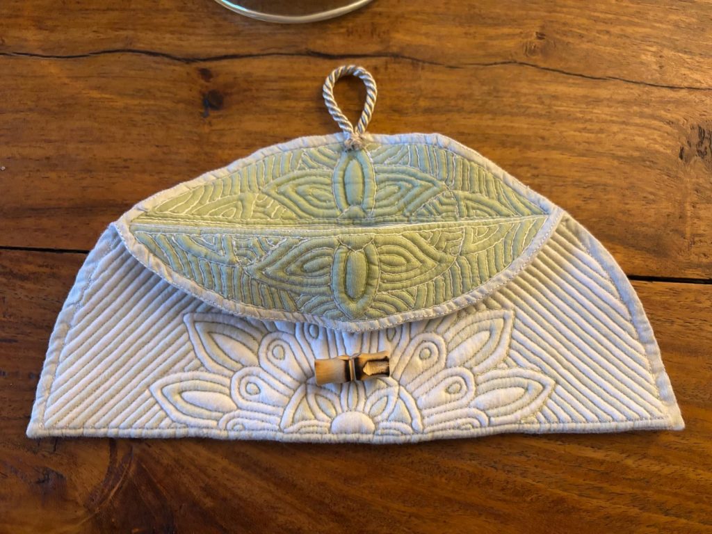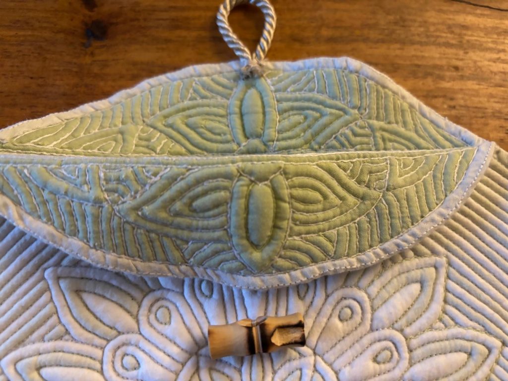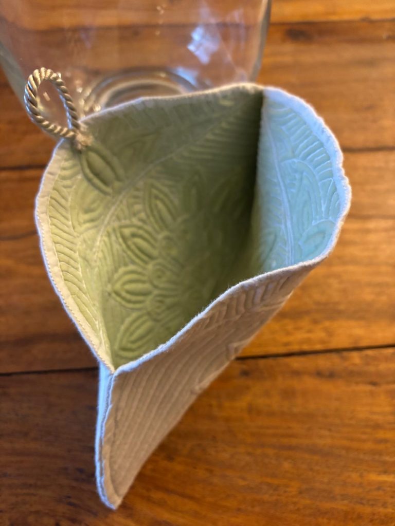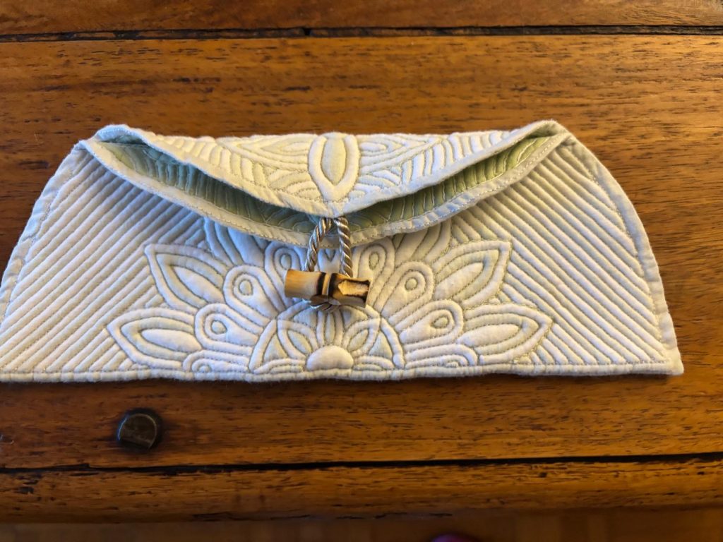 Un fond vert très délicat donne un chic fou à cette pochette dont la réalisation, tout autant que le montage, demande une dextérité dont Madeleine dispose largement. Tout au point de piqûre.