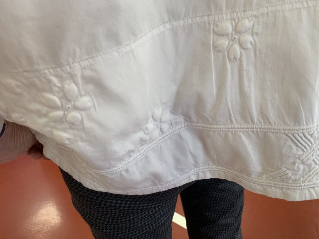 Elle ne s’est pas contentée du devant, elle a aussi broder quelques fleurs en broche et décoré le dos de motifs différents. Le col et le bas des manches ont été soulignés d’un léger tuyau.